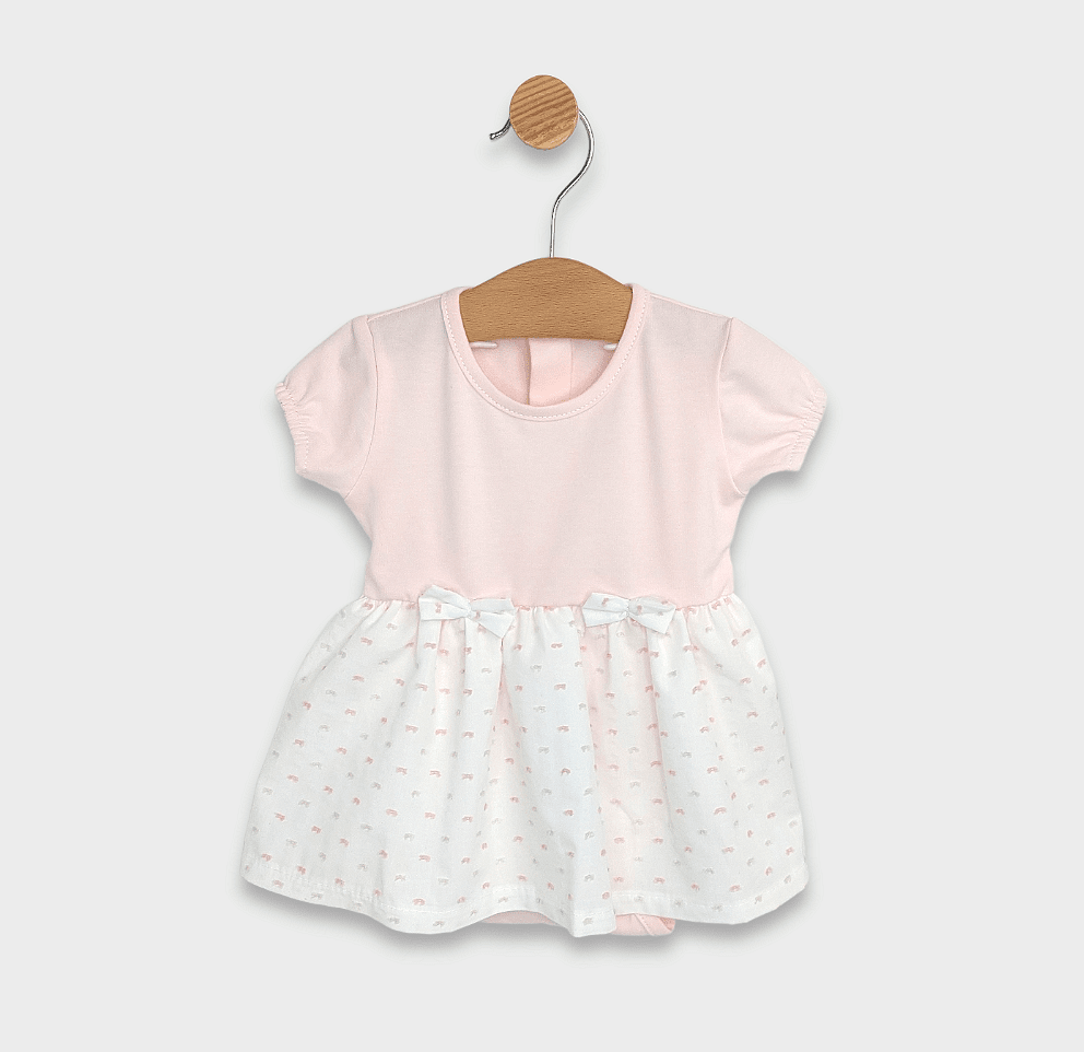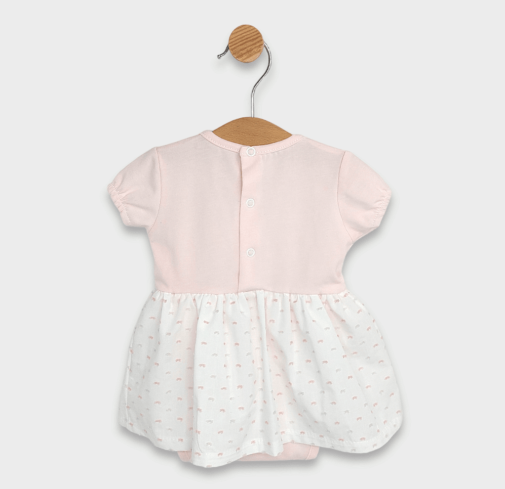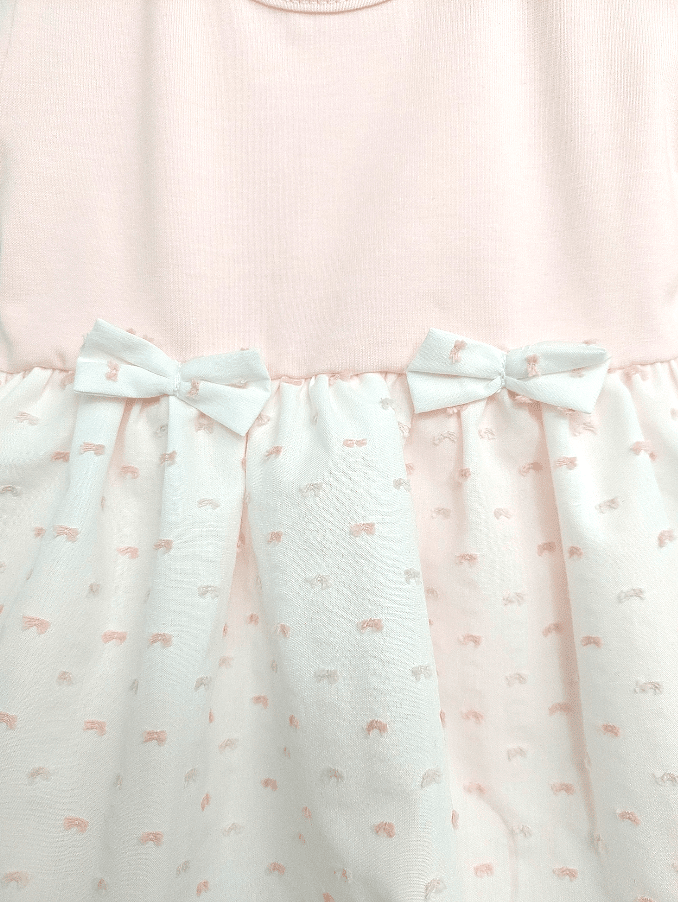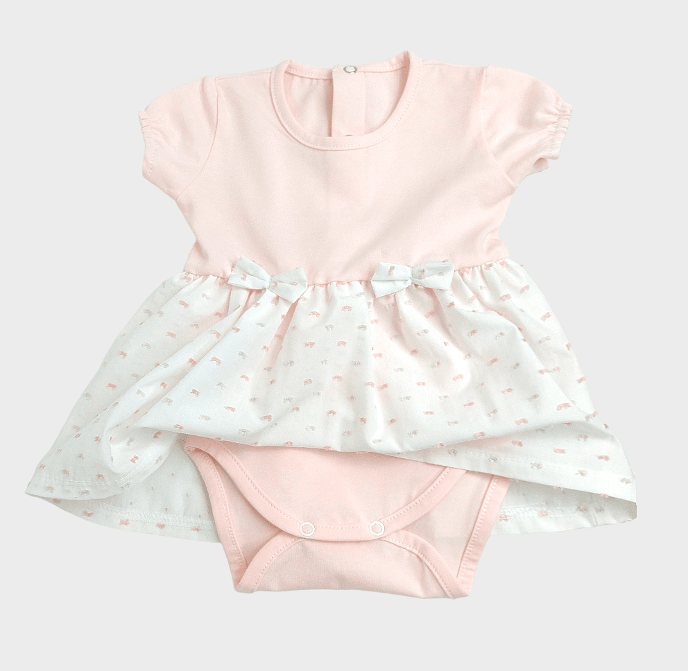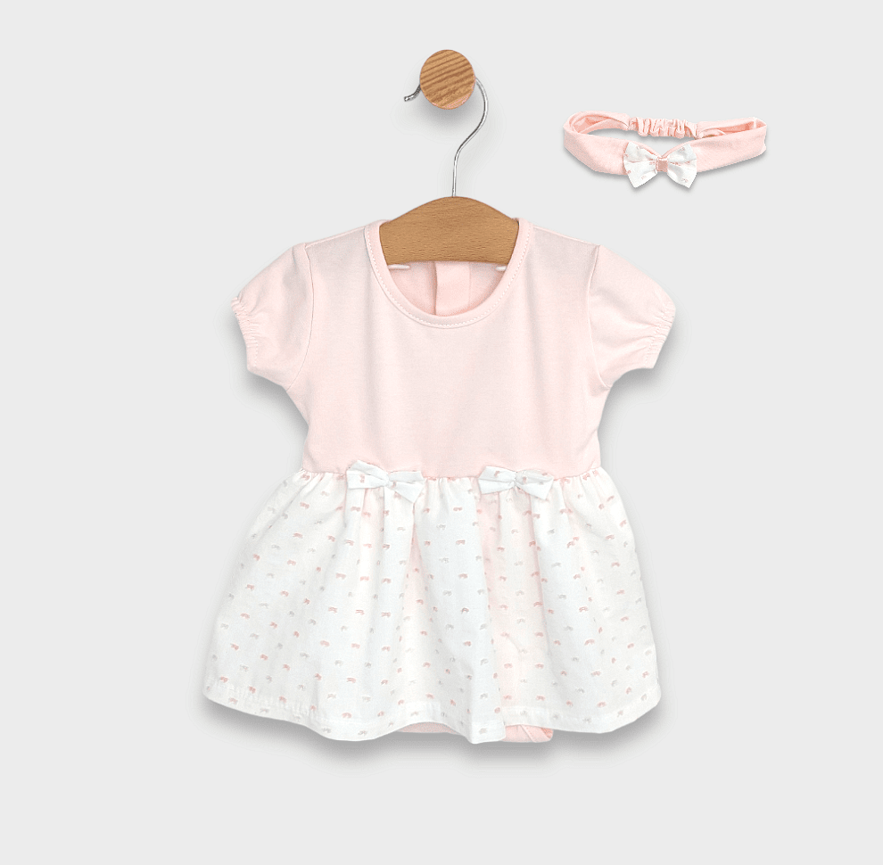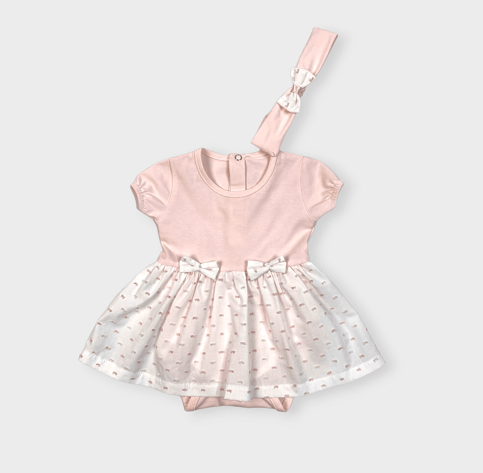 Разкошна бебешка боди - рокля с диадема за момиче от 0 до 12 месеца в нежни цветове. Горната част на роклята е с къси ръкави. Полата е разкроена. Бодито е пришито към роклята, като се закопчава отдолу, за лесна смяна на пелените. Елегантна и практична бебешка боди-рокля, подходяща както за ежедневието, така и за специален повод.