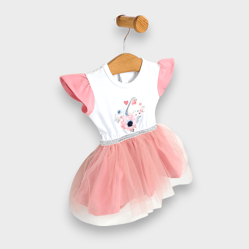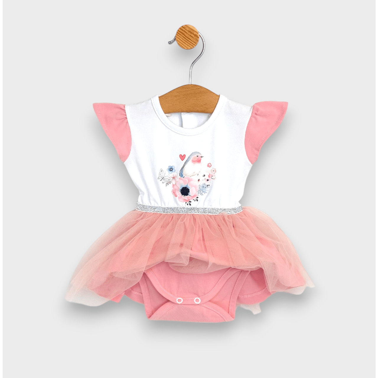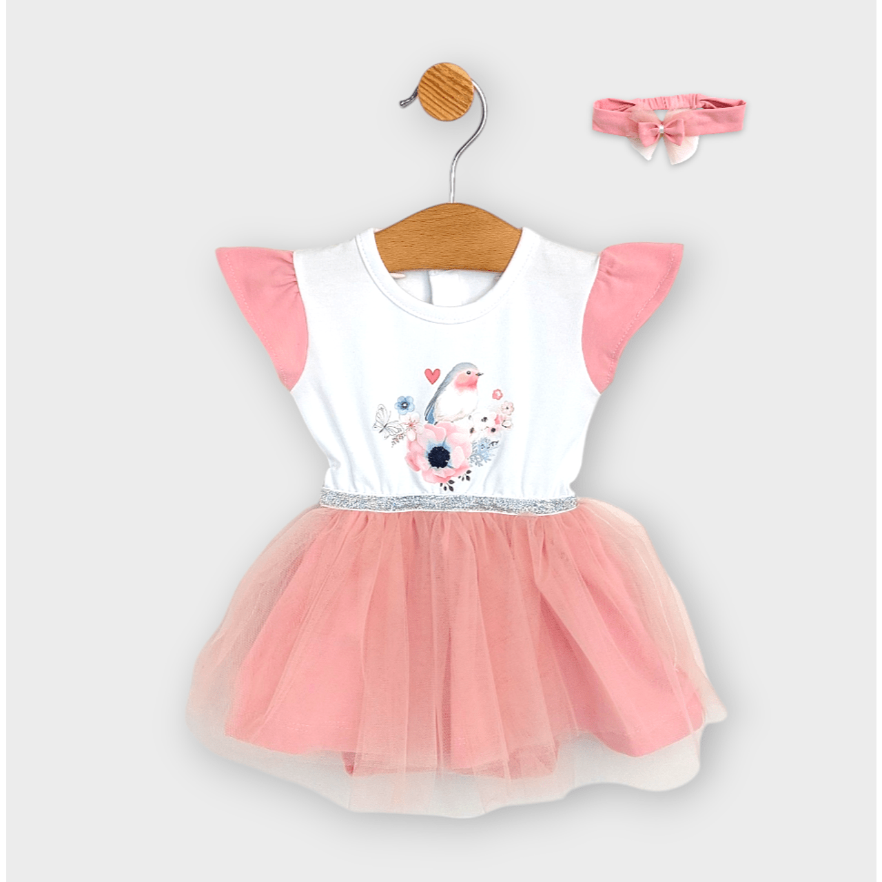 Тази очарователна бебешка боди-рокля е създадено с мисъл за най-малките модни икони от 56 до 80 см. Изработено от висококачествени материали, тя гарантира мекота и удобство за нежната бебешка кожа. Добавеният тюл придава игривост и елегантност, а съпътстващата диадема завършва визията за специален повод или семейно тържество.