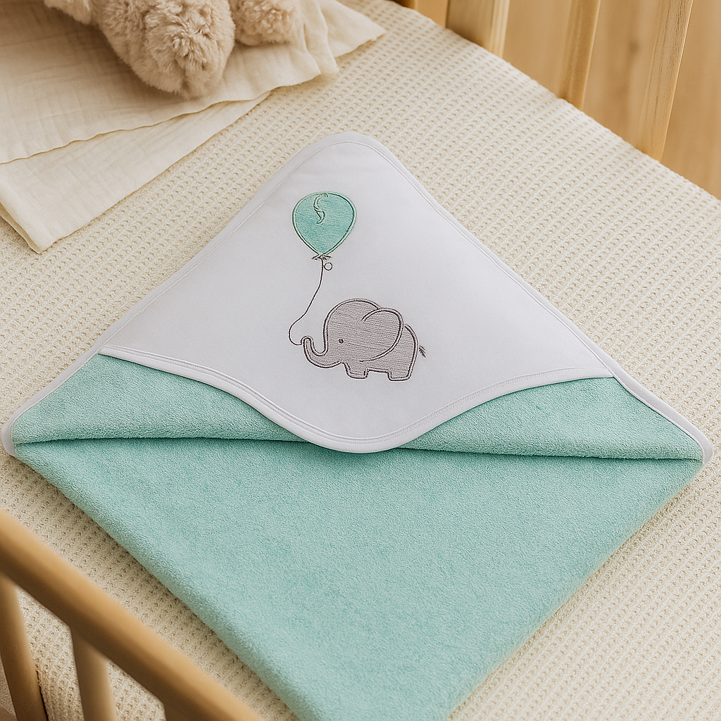 Бебешка хавлия за баня с качулка Слонче с балон е истинско удоволствие за тялото след топлата баня. Изработен е от висококачествен памук, който има силно абсорбиращи свойства и в същото време е нежен към деликатната бебешка кожа. Удобната качулка, дава възможност добре да увиете бебечето след баня, като така го предпазва от изстиване.