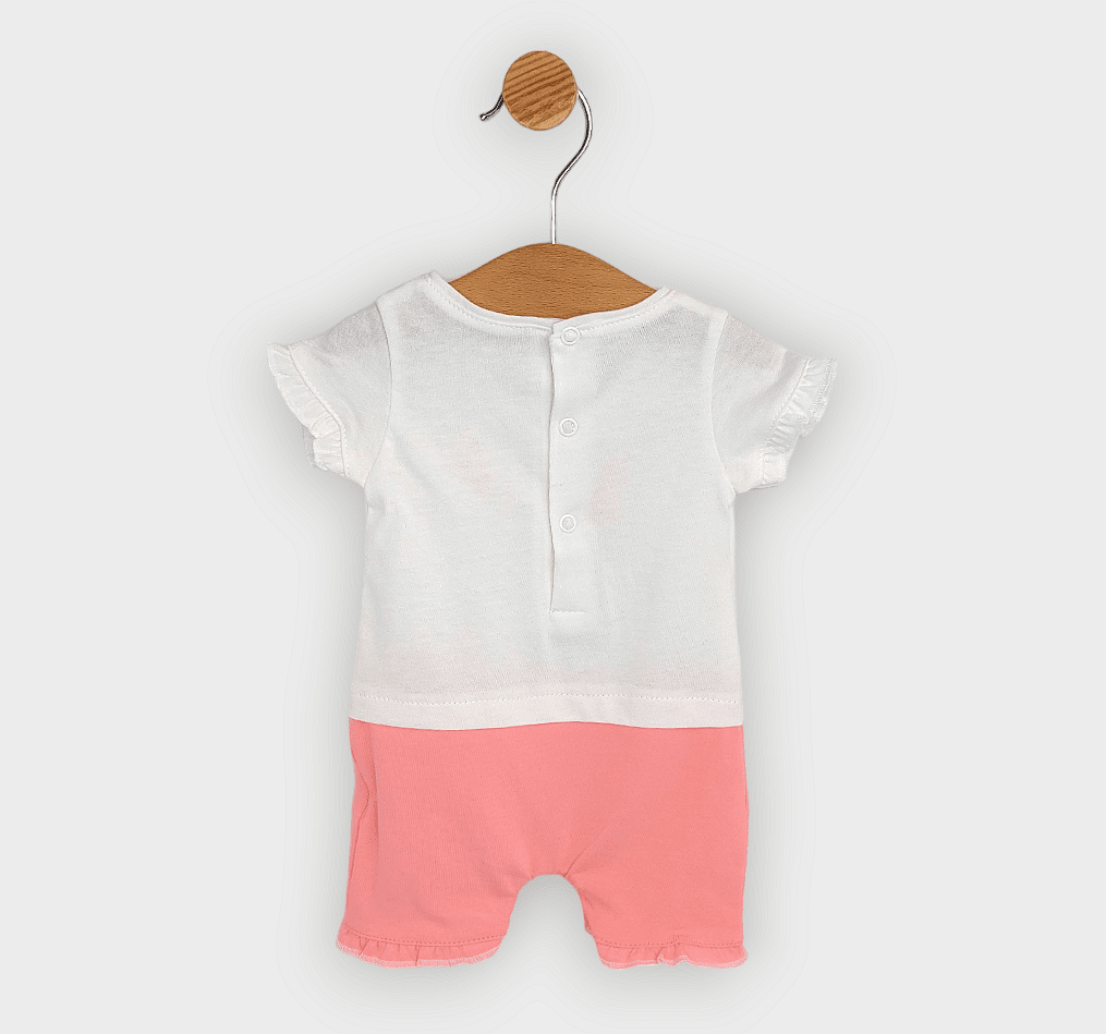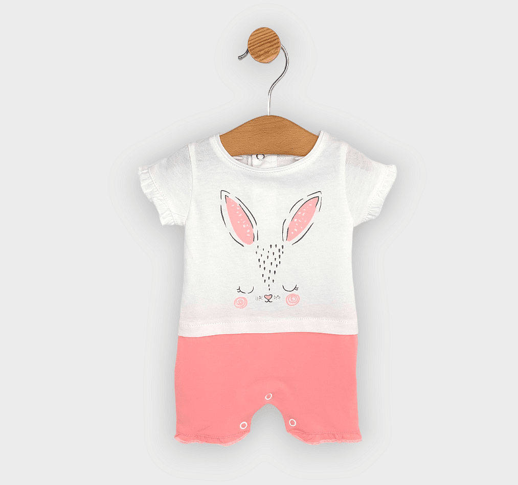 Бебешки гащеризон с къс ръкав Bunny за момиче от нежна и мека материя в пастелни цветове. С весела и закачлива картинка. Удобно закопчаване, посредством тик-так копчета за лесна смяна на пелени. Изработен от 100% памучна материя, щадяща деликатната бебешка кожа. Бебешкия гащеризон се предлага от новородено до 12 месечна възраст. Произведено от българския бранд Rainy.