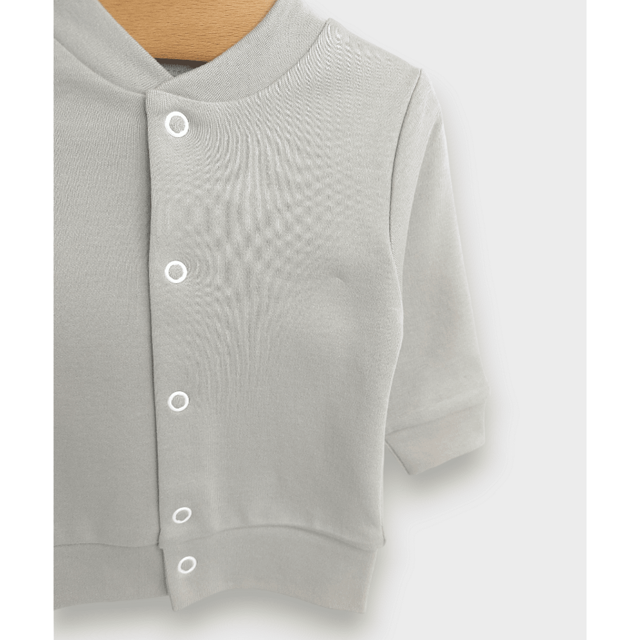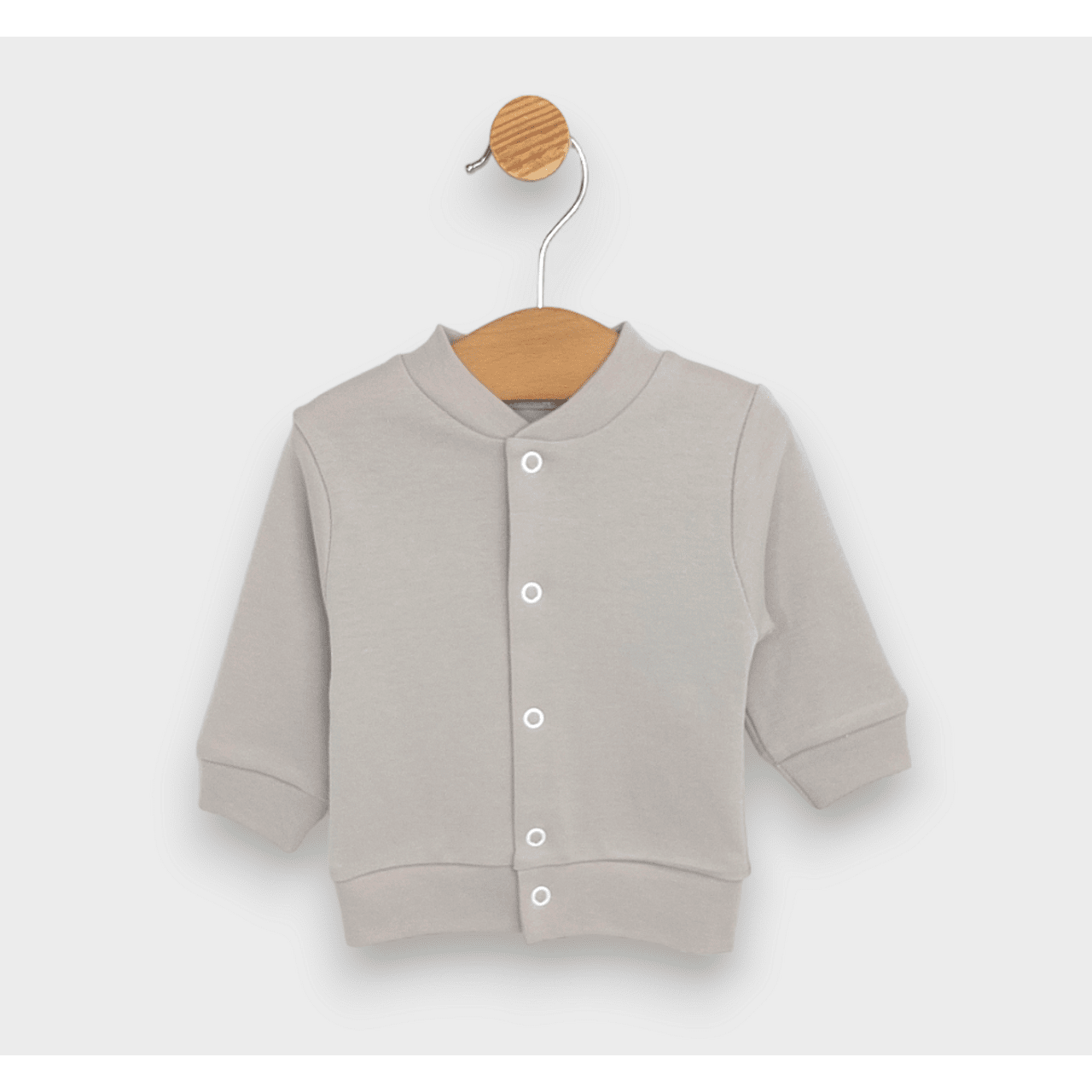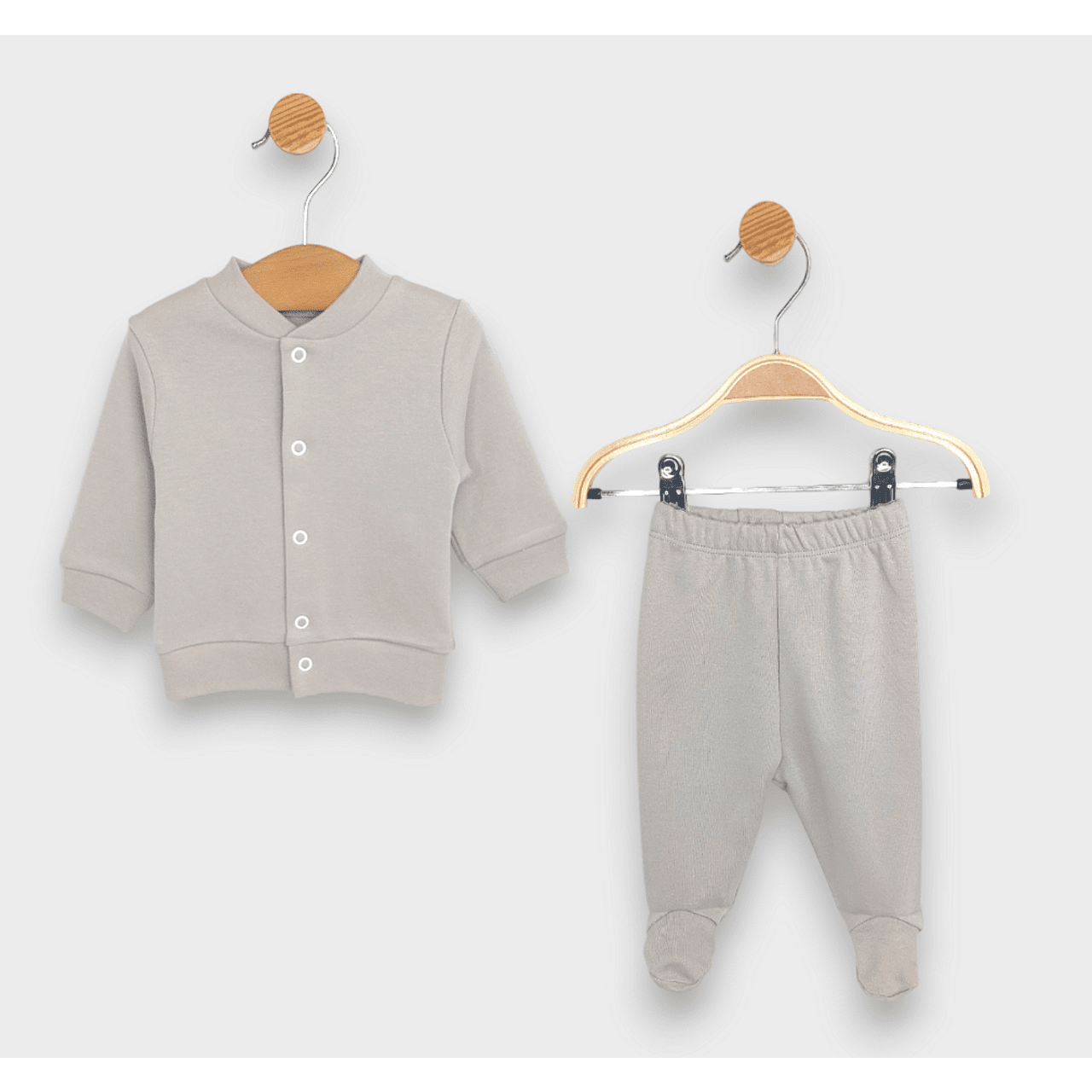 Бебешки комплект 2 части от нежна и мека материя в пастелни цветове. Комплекта включва жилетка с удобно закопчаване, посредством тик-так копчета и ританка с ластик. Бебешкия комплект се предлага от новородено до 6 месечна възраст. Произведено от българския бранд Rainy.