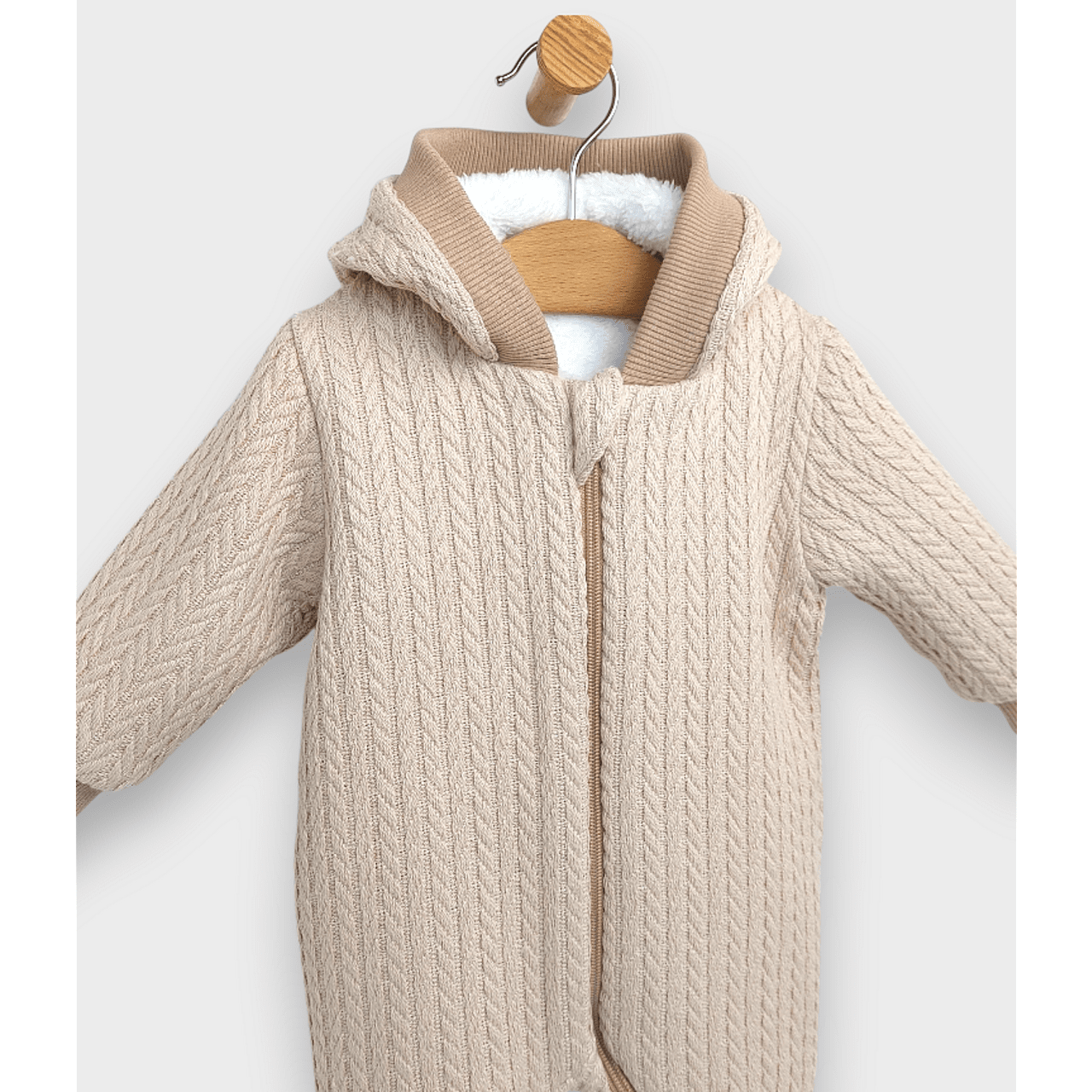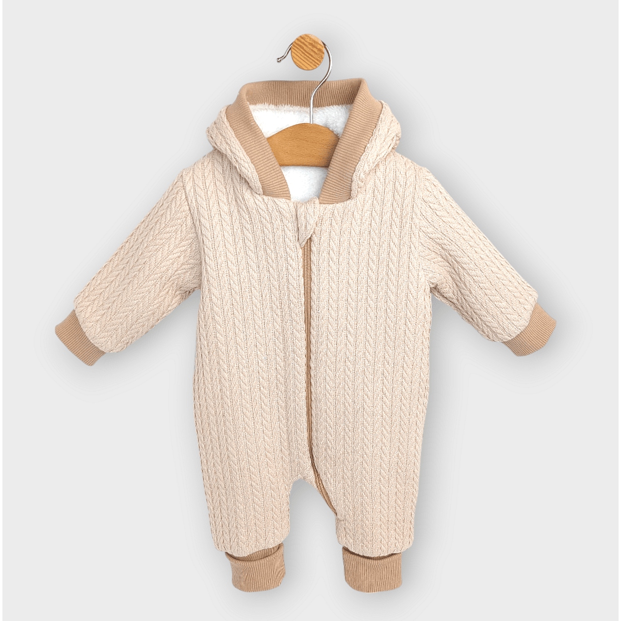 Този очарователен гащеризон е изработен от висококачествени плетива, които гарантират топлина и комфорт дори в студените дни. С удобния цип по цялата дължина, обличането и събличането става бързо и лесно, а качулката добавя допълнителна защита за главичката на вашето бебе. Със своята нежна бежова цветова гама, този гащеризон е идеален за малкиките и се предлага в размери от 56 до 80 см.
