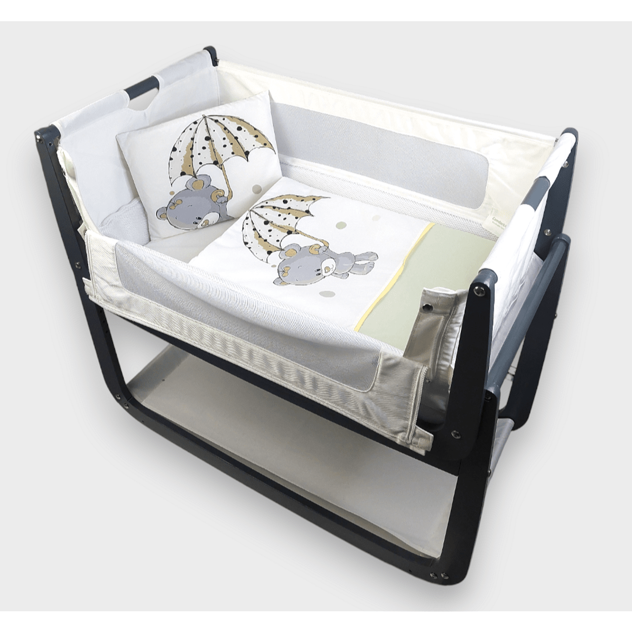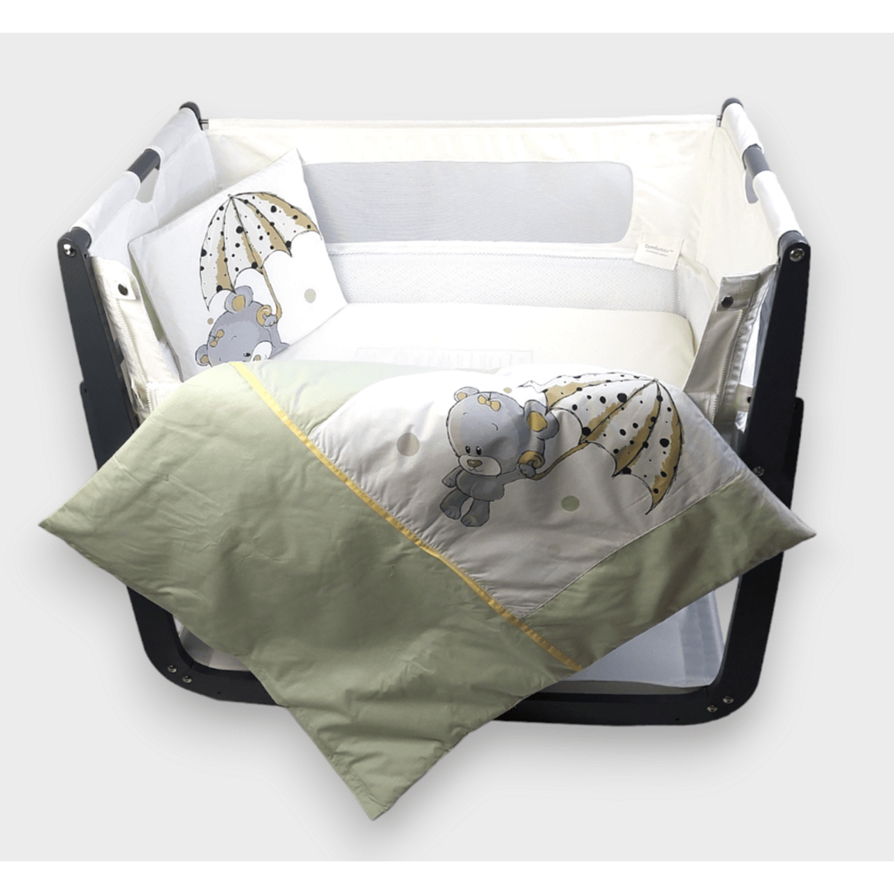 Бебешки спален комплект за мини кошара и люлка от ранфорс Сиво мече с чадър.
