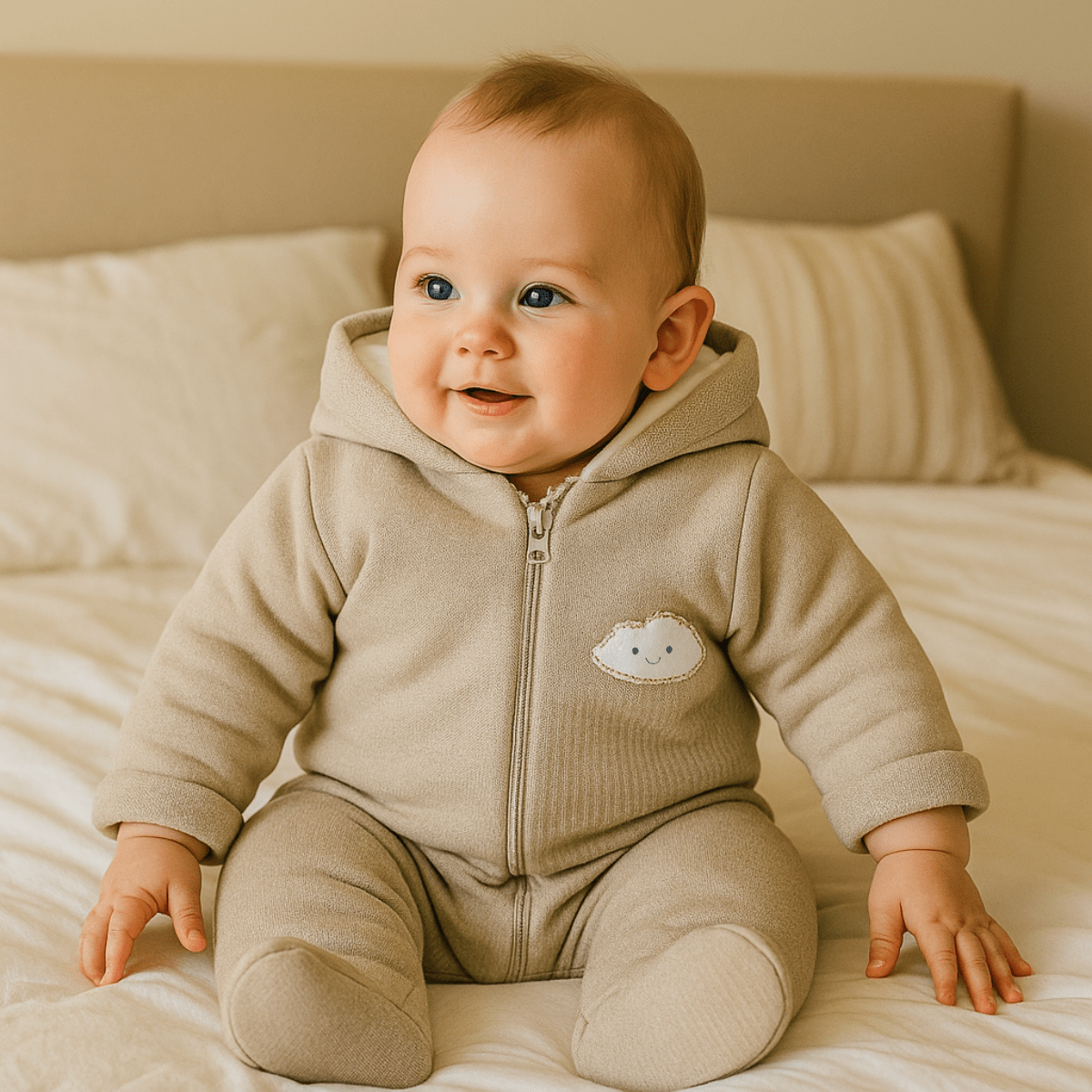 Ватираният плат осигурява допълнителна топлина, а меката, бяла подплата предлага допълнителен комфорт и изолация. Дизайнът с качулка защитава главичката на бебето през по-хладните дни, а интегрираните чорапки поддържат крачетата топли.