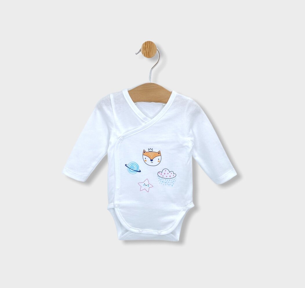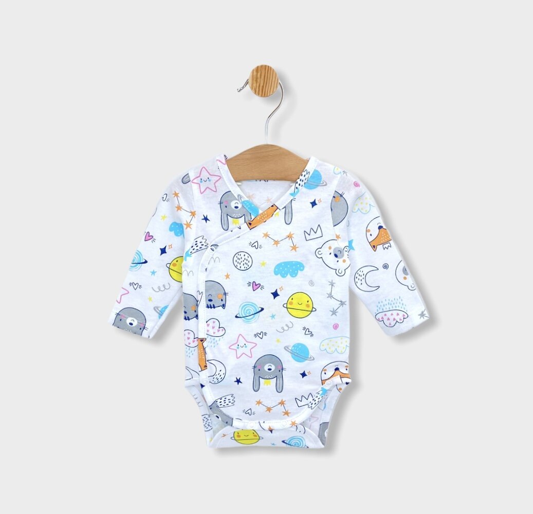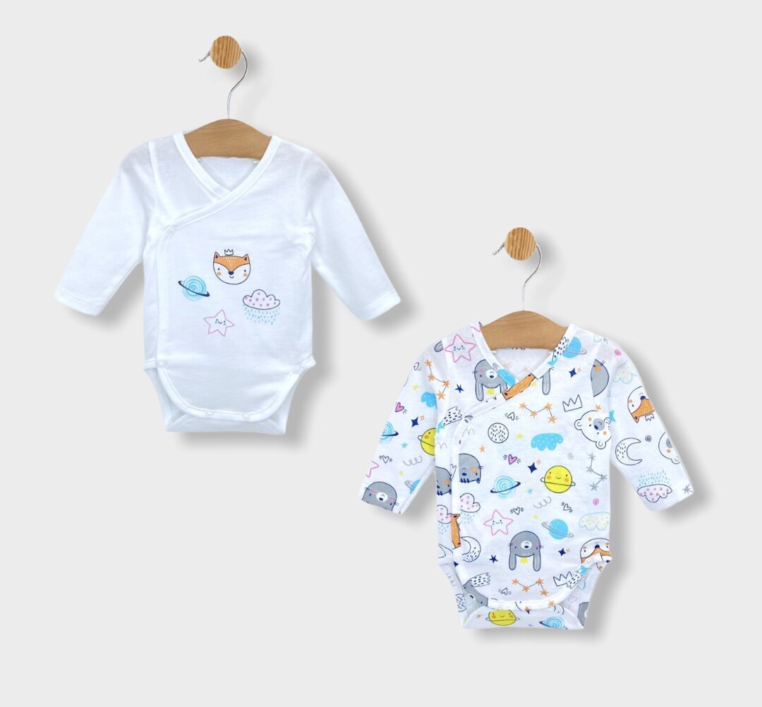 Комплект бодита 2 части Animals със странично закопчаване от нежна и мека материя в пастелни цветове. С весела и закачлива картинка. Удобно закопчаване, посредством тик-так копчета за лесна смяна на пелени. Изработена от 100% памучна материя, щадяща деликатната бебешка кожа. С весела и закачлива картинка. Бебешкото боди се предлага от новородено до 6 месечна възраст. Произведено от българския бранд Rainy.